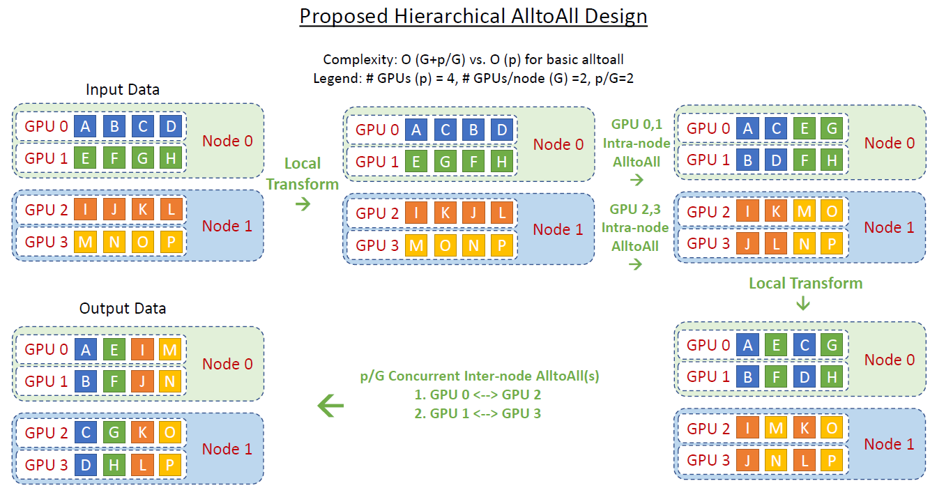 其中, 表示集群内所有 GPU 的数量,这里 ; 表示一个节点内的 GPU 数量,这里 。那么,节点数量为 。这个算法具体执行过程如下: